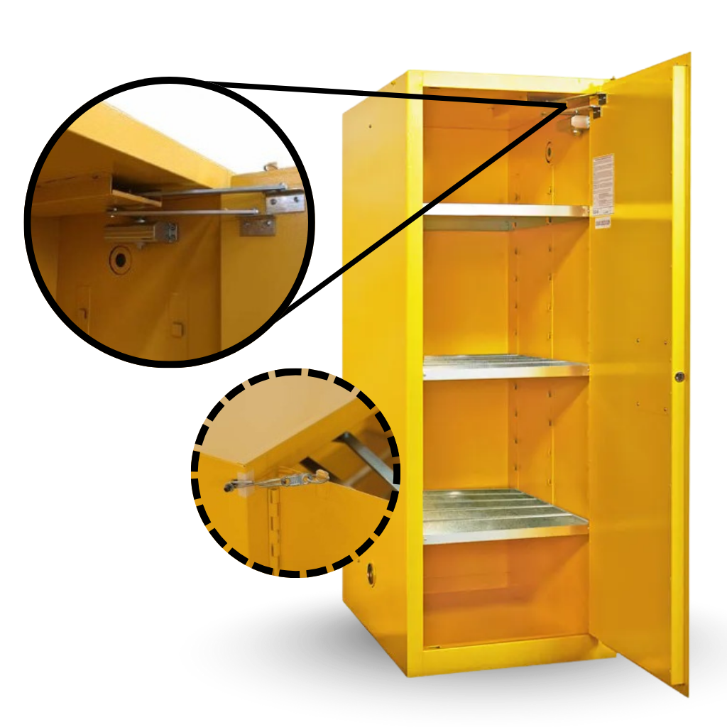 Self-closing doors are equipped with spring-loaded mechanisms that automatically shut the cabinet to contain flammable fumes or chemical spills, ensuring maximum safety and compliance with regulations.