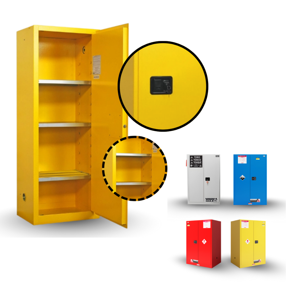 Designed for the safe storage of combustible liquids and materials including paints, inks, dyes, coatings, and aerosols. These cabinets feature explosion-resistant steel construction, electrostatic grounding to prevent spark ignition, and self-closing or manual double doors for added safety. Their superior ventilation and containment design reduce fume buildup while maintaining compliance with international fire-safety standards.