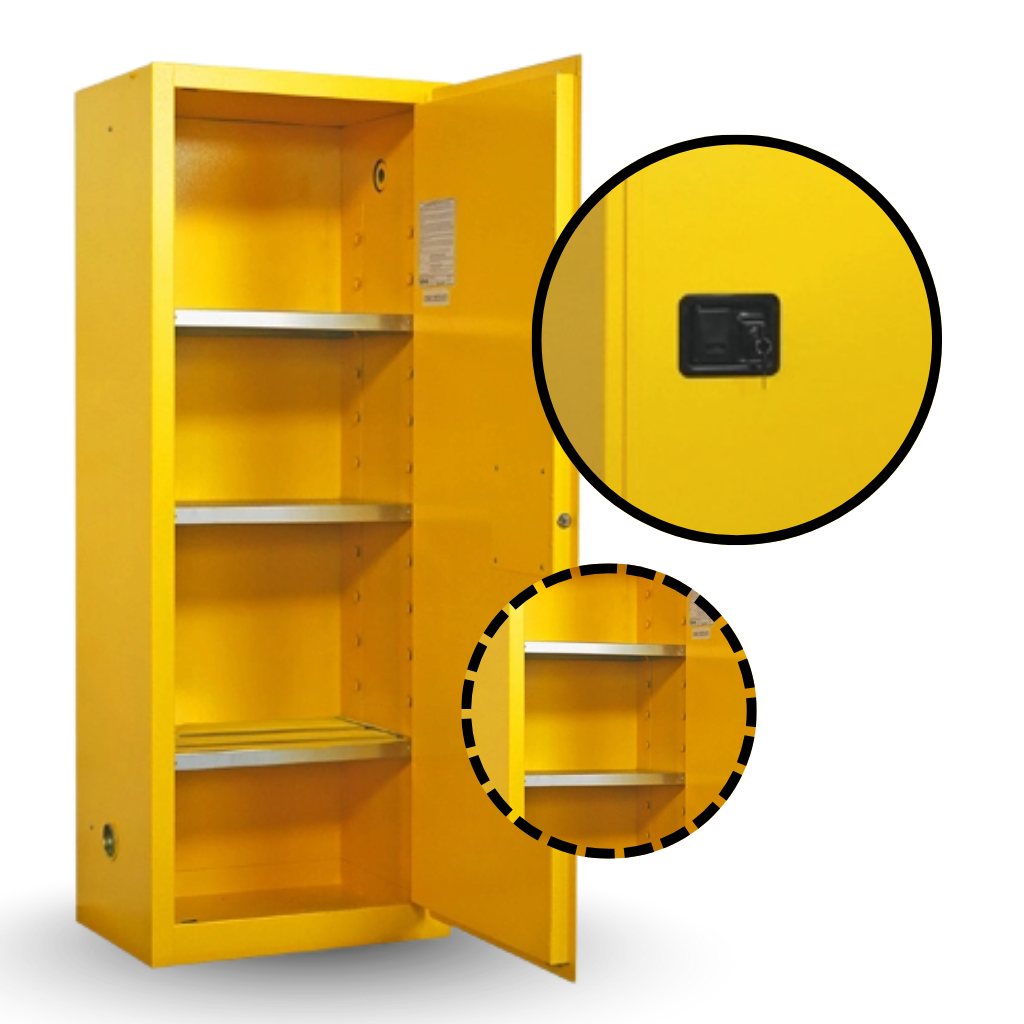 The manual door operates smoothly through heavy-duty galvanized steel hinges, designed for durability and ease of use. These cabinets are equipped with a keyed lock to prevent unauthorized access, providing added security for hazardous substances. The manual opening system allows for controlled access to materials, ideal for workplaces requiring frequent but safe access.