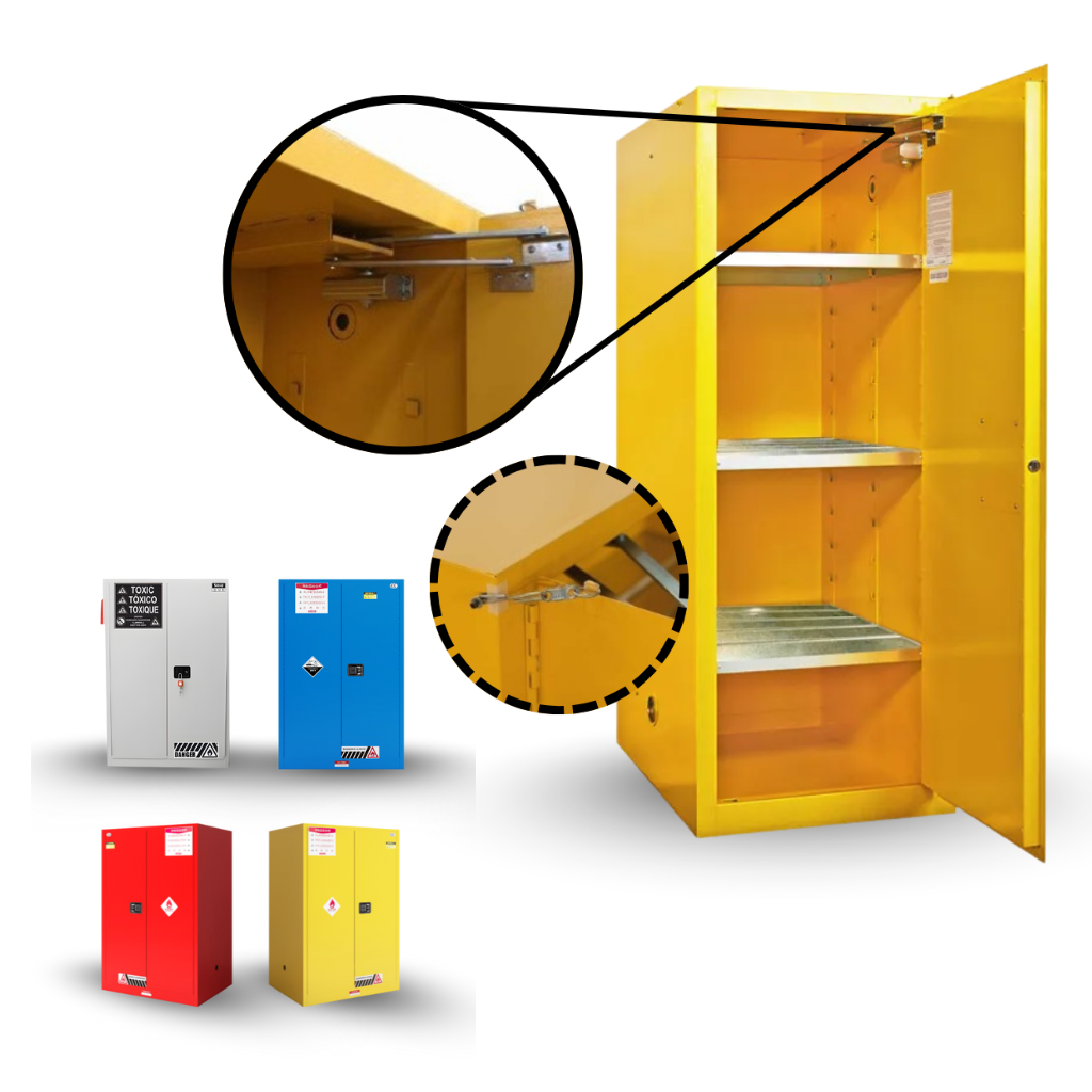 Our Self-Closing Safety Cabinets are equipped with a self-closing device designed for added safety in the event of a fire or emergency. This device, independently developed and thoroughly tested, has been proven to withstand over 100,000 cycles of opening and closing, ensuring reliable operation.